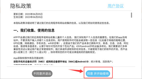 首次打开应用时,请在隐私政策页面点击同意,之后即可开始使用。