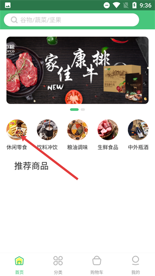 2、进入首页后,点击分类栏里的【休闲零食】选项,查看该分类下的商品列表,并浏览页面呈现的推荐商品信息。