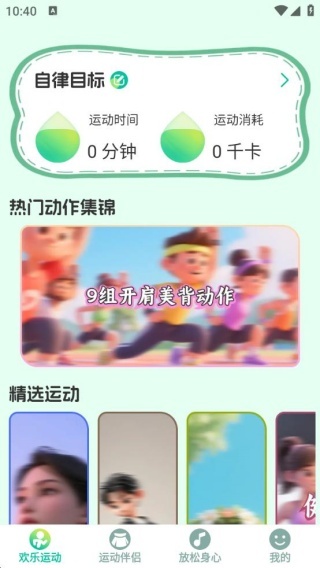 安装软件并打开后,进入欢乐运动界面,在这里既可以定制自律目标,也能查看热门动作集锦。