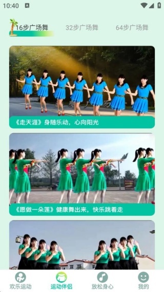 2、运动伴侣平台为用户提供了多样的广场舞教学资源,涵盖16步、32步、64步等不同节奏的广场舞内容,用户可根据自身需求自由选择学习。