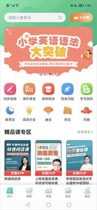小学英语同步学是一款操作便捷的学习软件,功能十分丰富,已与小学最新版的所有课程同步。它为学生用户提供了同步视频、课外拓展课程、课本朗读音频、习题解析以及各类学习资料等内容。学生们能在这里开展多元化学习,有效增强学习兴趣。在推荐页面,软件为学生精心挑选了各类优质视频课程,方便大家直观浏览;点读功能则是助力学习的实用工具;绘本板块更适合低龄学生使用。