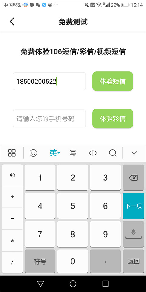 2、在弹出的新页面里,把自己的号码填写到对应的群发业务栏中(这里以体验短信业务为例)