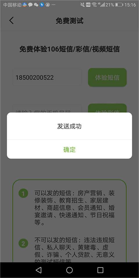 3、之后点击体验按钮后,即可将短信发送到自己的上