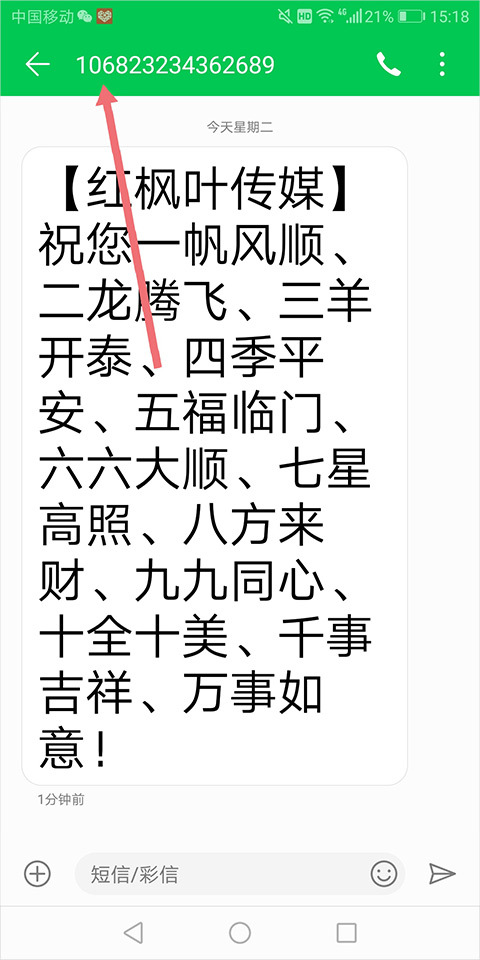 4、用户能够看到短信的发送方号码是以106开头的(下图中红色箭头所指的区域即为该位置)
