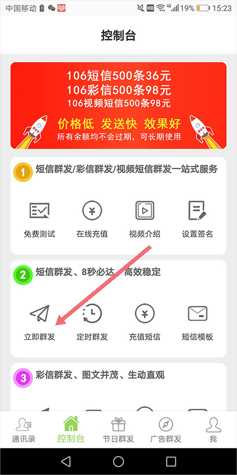 1、当用户有群发短信的需求时,可先进入软件的【控制台】页面,随后在短信群发板块点击【立即群发】(若需发送彩信或视频短信,则点击对应类型的立即群发按钮即可)