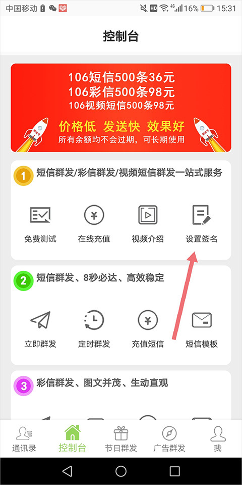 4、因为106短信要求必须使用签名,用户可以先进入【控制台】页面,然后点击【设置签名】