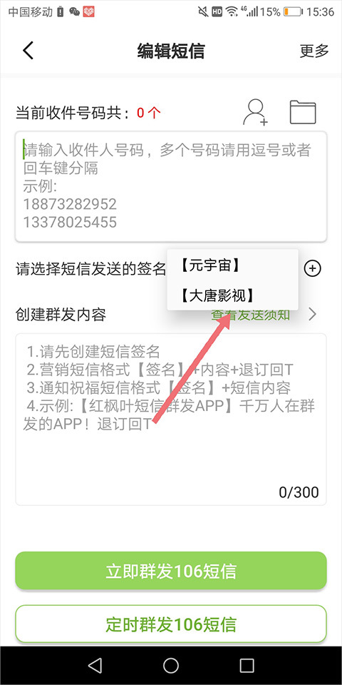 5、之后用户每次群发时可以选择签名