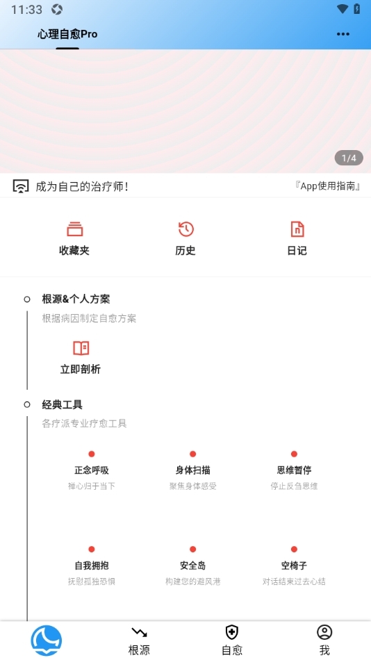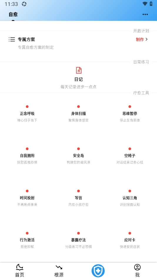 2、自愈模块支持制定专属方案,下方配备了一些自愈工具,另外还能查看历史测评报告、收藏感兴趣的课程与文章,从细节层面出发,为用户打造舒适、安心的使用氛围。