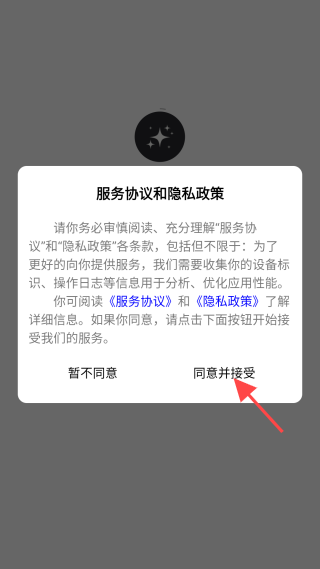 1、安装后,阅读同意“服务协议和隐私政策”。