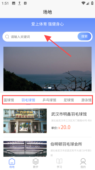3、进入【场地】界面后,可通过浏览分类列表或在搜索框中输入关键词的方式,查找自己需要的场地。
