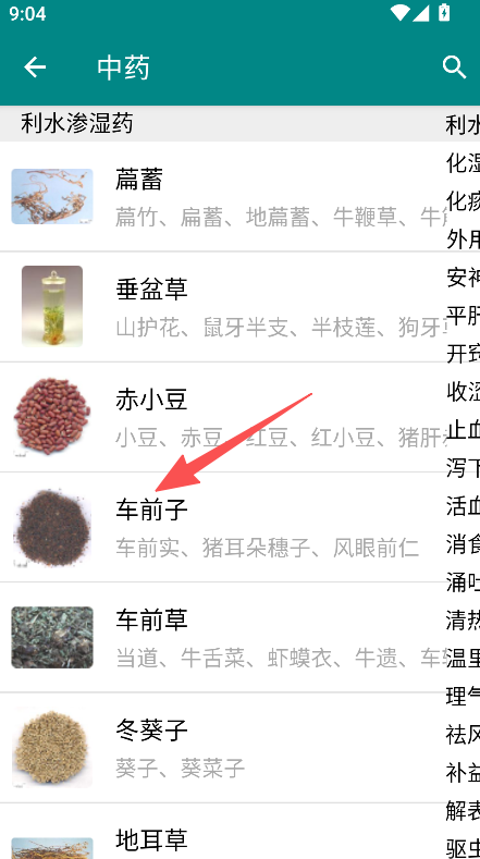 1、点击“中药”选项,进入中药列表页面,从中挑选具体的药材(例如车前子)。