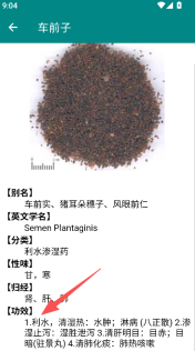 2、查看药材详情,了解别名、性味、归经等信息。