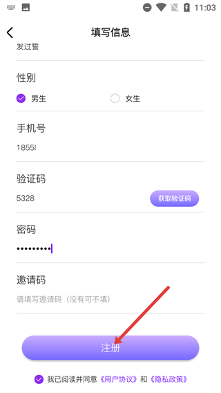 3、进入信息填写页面后,把性别、手机号等信息填写完整,同时勾选对应的相关协议,接着点击【注册】按钮,这样就能完成账号注册的整个流程了。