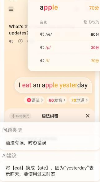 5、系统会依据你的输入实时给出对应的反馈结果,能让你在练习口语的同时,同步了解词义和语法的使用方式。