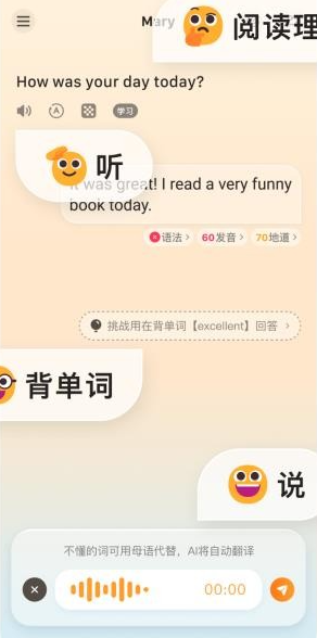 1、全天候AI外教随时陪练,助你实时纠正发音与语法问题。