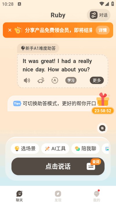 4、为你打造了超有个性的AI朋友,学习的过程就像愉快聊天一样轻松;这里有海量的场景与实用工具,学语言不再需要死记硬背,只需沉浸在真实语境中练习AI口语即可。