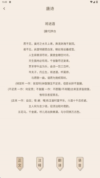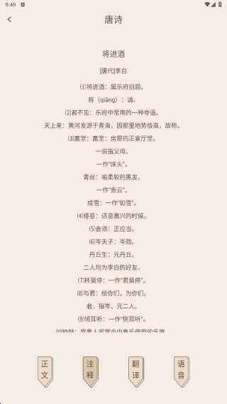 从诗经到楚辞,从唐诗到宋词,全面涵盖各类经典文学体裁,能够满足不同年龄段用户的学习需求。