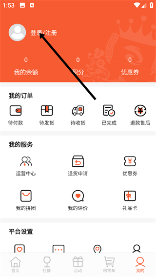 2、进入“我的”页面后,找到并点击【登录/注册】选项,即可进入登录注册界面。