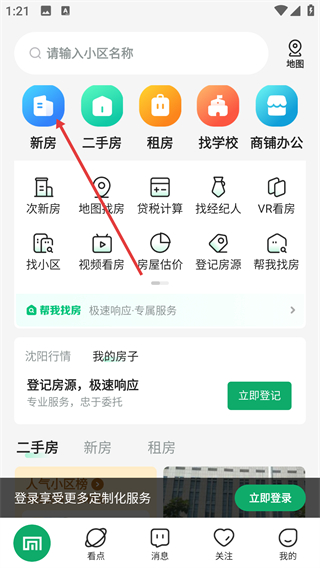 1、在房产类应用的首页,点击【新房】选项后,就能进入新房信息展示页面,浏览各类新房资源。