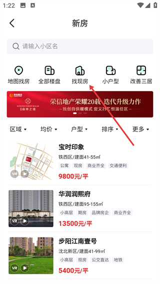 2、在新房页面,点击【找现房】标签,就能筛选出当前处于现房状态的楼盘列表,方便用户快速定位。