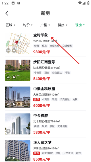3、在现房列表里,点击你想了解的楼盘(比如【宝时印象】),就能进入该楼盘的详情页查看详细信息。