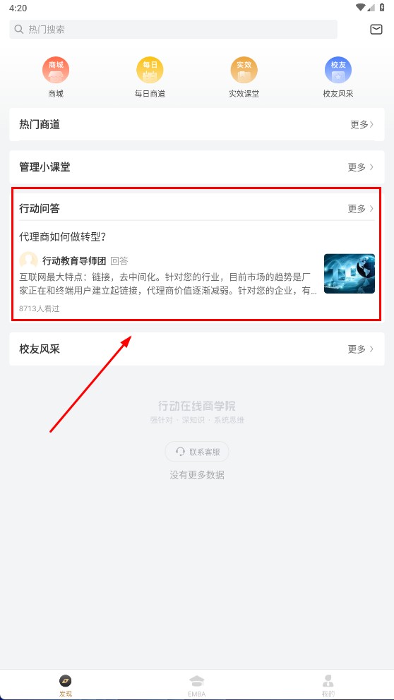 1、在应用首页找到【行动问答】板块,浏览热门问答内容,从中获取企业管理问题的专业解答与实用建议。