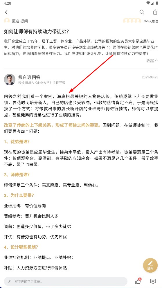 2、进入匿名提问的详情页面,查看【熊启明】老师给出的专业解答,学习如何运用案例分析与机制设计的方法来解决带徒过程中遇到的难题。