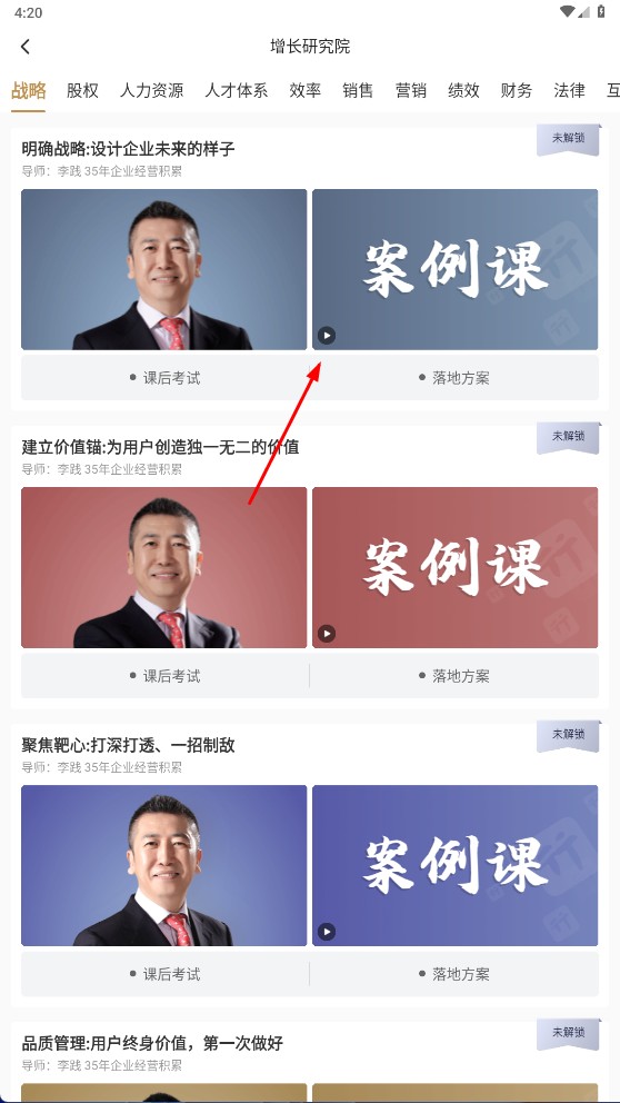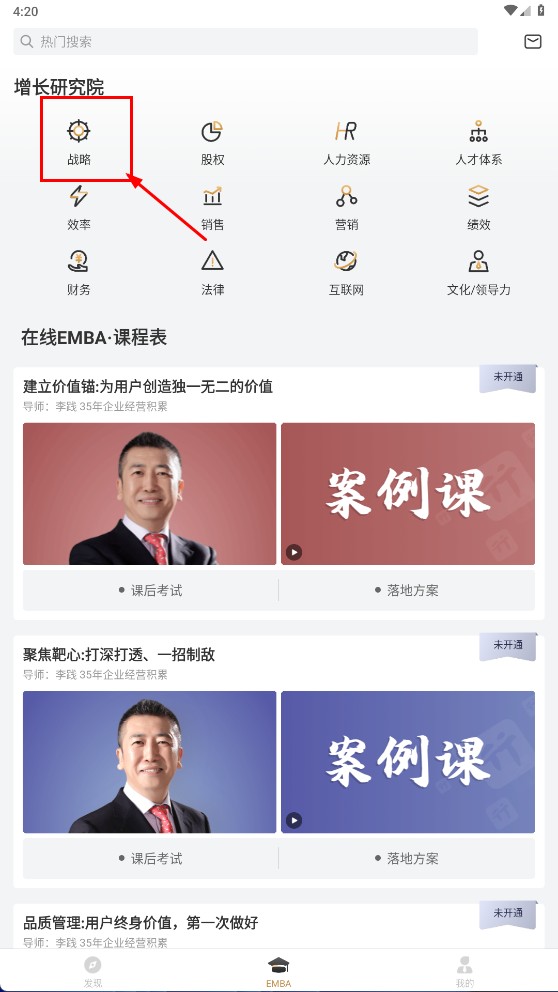 3、进入增长研究院页面后,点击【战略】板块下的【股权】模块,打开在线EMBA课程表,浏览课程内容并挑选案例课进行学习。