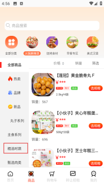 在火锅麻辣烫分类页面,点击左侧的“精选时蔬”选项,即可进入精选时蔬的商品列表页面。