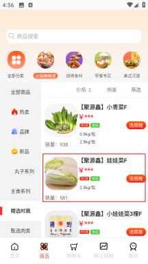 3、在精选时蔬的商品列表页面,挑选聚源鑫娃娃菜F,然后进入该商品的详情页面。
