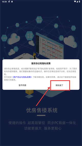 1、启动优房售楼系统,点击【我知道了】按钮以确认《服务协议和隐私政策》,随后进入应用流程。