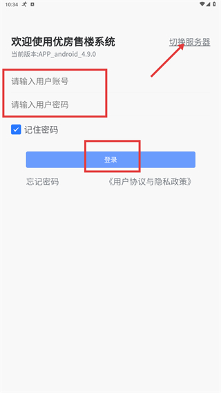 2、在登录页面,填写【用户账号】和【用户密码】,勾选“记住密码”选项后,点击【登录】按钮;若需要配置网络信息,也可以点击“切换服务器”进行操作。