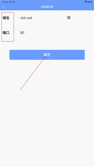 3、进入切换服务器页面后,填写【域名】(例如slxt.net)和【端口】(例如80),点击【确定】按钮,即可完成服务器配置并回到登录页面。