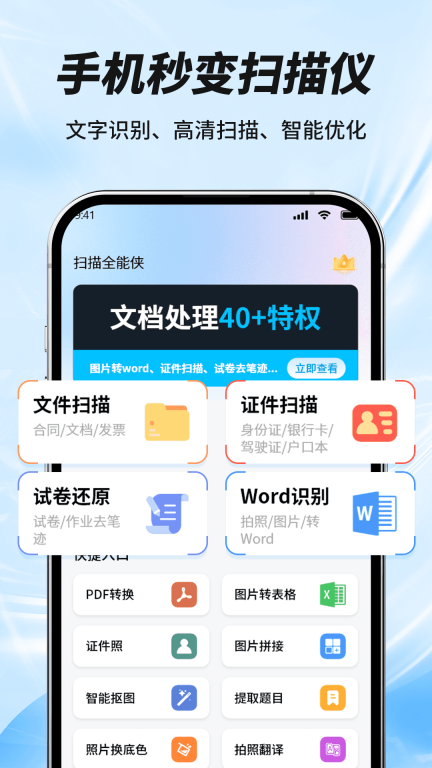 1、主页上配备了各类文档处理功能,涵盖文件扫描、证件扫描、试卷还原以及Word识别等服务;