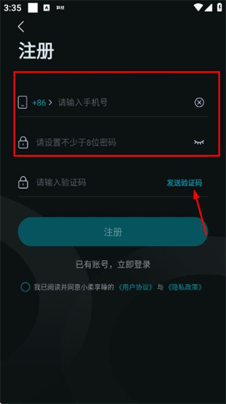 2、进入注册账号页面后,在手机号码输入框填写手机号,设置好密码,接着点击发送验证码按钮。