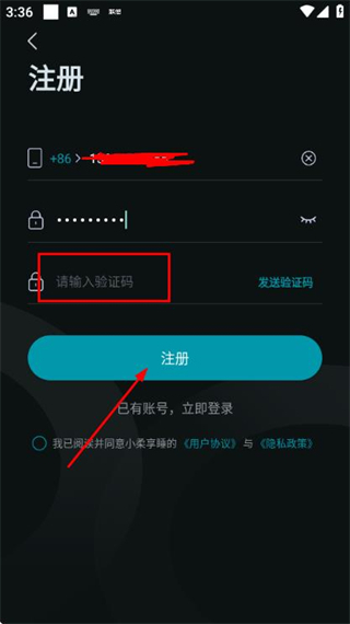 3、在账号注册页面输入验证码,勾选相关协议后,点击注册按钮,即可完成账号注册流程。