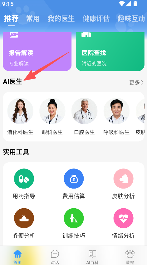 1、打开爱宠医生,点击AI医生板块进入对应页面。