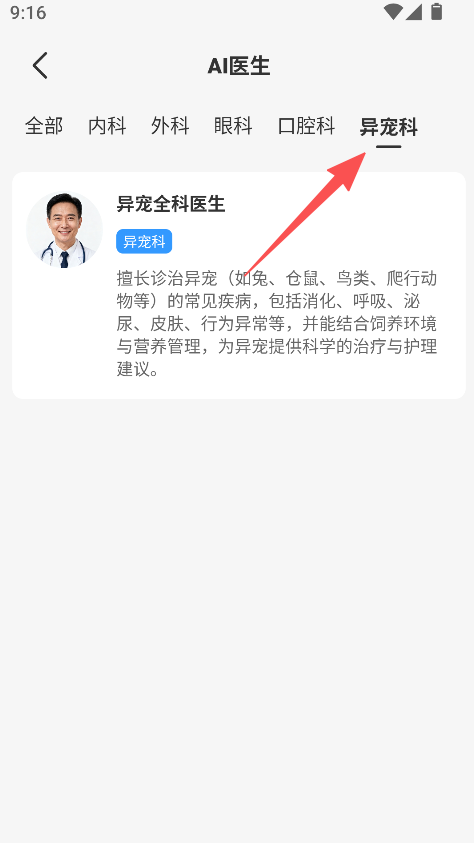 2、在页面中找到并选择“异宠科”板块,随后浏览异宠全科医生的相关介绍信息。