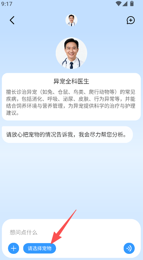 3、点击输入框,选择宠物后咨询宠物健康相关问题。