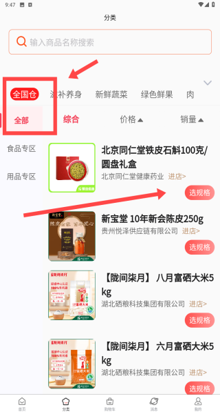 3、在分类页面可以看到全国仓库的商品,品类齐全、应有尽有,供顾客挑选。