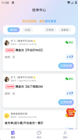 首页设有微信区与QQ区两个分区,并且针对这两个分区分别提供了护航单和装备单服务。