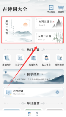 4、最后可别忘了国学经典和我的收藏区域呀,那些自己喜欢的诗词都能存放在这里,方便随时慢慢品读。