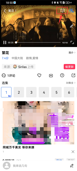 2、点击影片进入播放页面后,再次点击播放屏幕会出现进度条,此时点击上方的“TV”标志,这个就是投屏按钮。