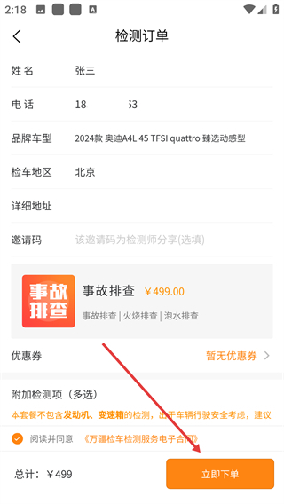 3、在检测订单界面依次填写姓名、品牌车型、检车地区、详细地址等相关信息。