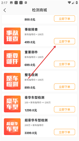 2、在检测商城里找到【事故排查】这项服务并选中,接着点击【立即下单】按钮,就能进入检测订单的操作界面了。