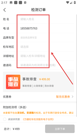 4、请勾选【阅读并同意《万疆检车检测服务电子合同》】这一选项,随后点击【立即下单】按钮,即可完成检测服务的下单流程。