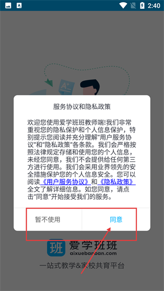 1、在使用【爱学班班教师端】之前,需要了解该平台为一站式教学与家校共育平台,且平台承诺会依法保护用户的个人信息;点击【同意】按钮后,您就能进入应用开始使用了。