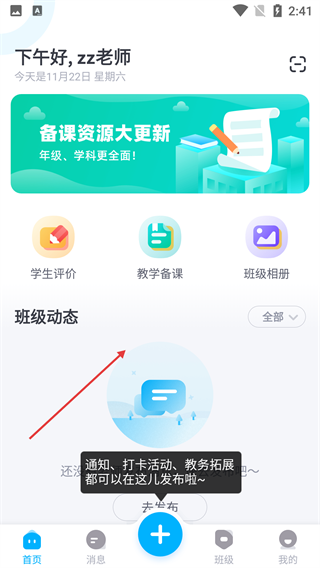 进入主界面后,能够使用“学生评价”“教学备课”“班级相册”等功能,借助底部的“+”按钮发布通知、打卡之类的班级动态。