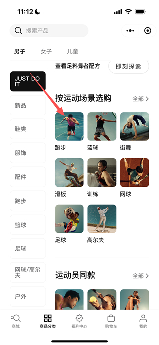 2、在商品分类页面,点击跑步场景选项,即可进入跑步类商品的列表页面。