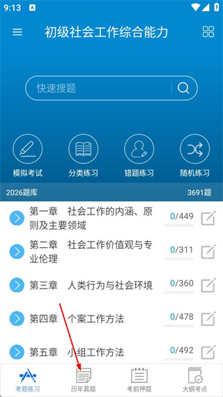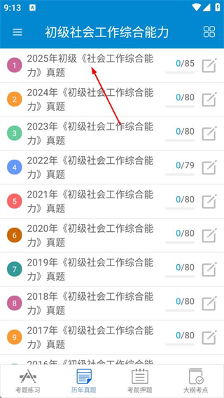 1、打开社会工作者华云题库首页后,找到页面底部的“历年真题”选项并点击,即可进入真题列表页面。